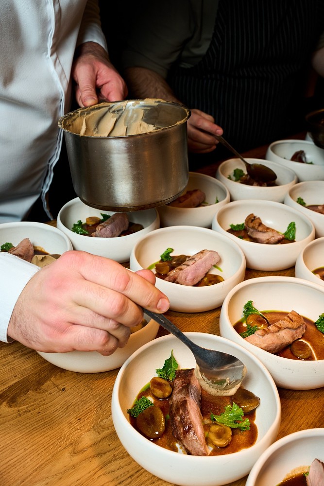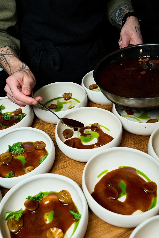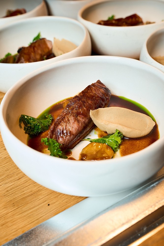 • Умами: тапас из печени птицы с угрем, унаги и маринованным яблоком — глубокий и насыщенный вкус, символизирующий культуру умами.