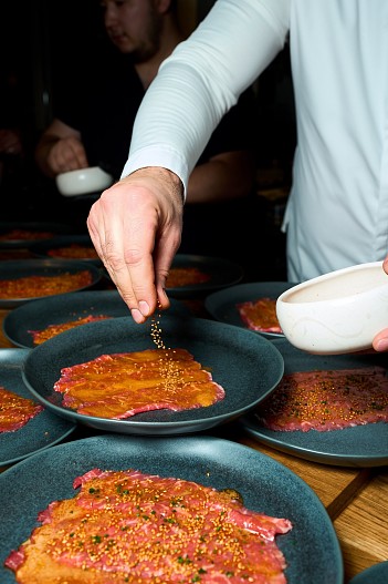 • Острое: карпаччо из стриплойна с соусом кимчи — острота и изысканная текстура классического карпаччо в сочетании с корейским колоритом.