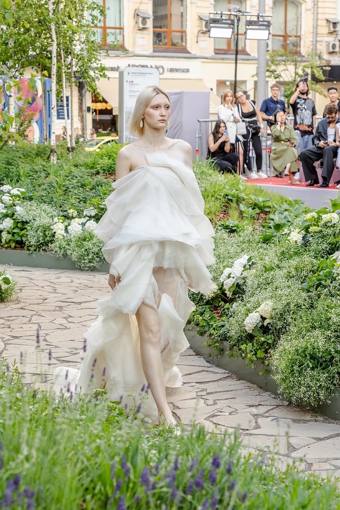 Зрители оценили изящные женственные образы для мужчин и женщин — платья из парящих тканей, с цветочным принтом, живыми цветами и утонченными аксессуарами. Все образы гармонично вписаны в городское оформление с живыми зелеными насаждениями, создав цельную и запоминающуюся атмосферу сказочного леса.