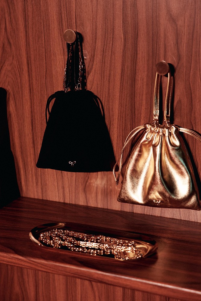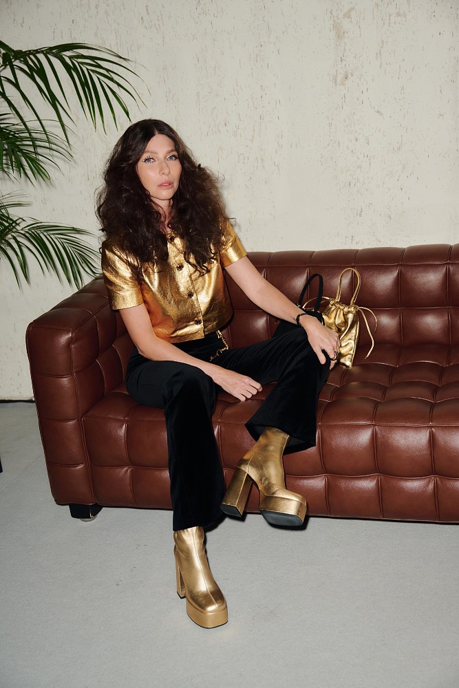 Среди ключевых цветов: яркий золотой, два оттенка шоколадного, классический черный и универсальный молочный. Все изделия украшены кожаной подкладкой цвета золотого металлика — отсылкой к клубной эстетике и «внутреннему сиянию» героини коллекции.