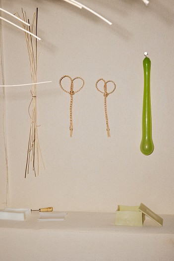 В центре внимания — соломенная инсталляция, отсылающая к скульптурам, и подиум с предметами, реконструирующими процесс создания работ: инструментами, образцами материалов, заготовками и артефактами мастерских авторов.