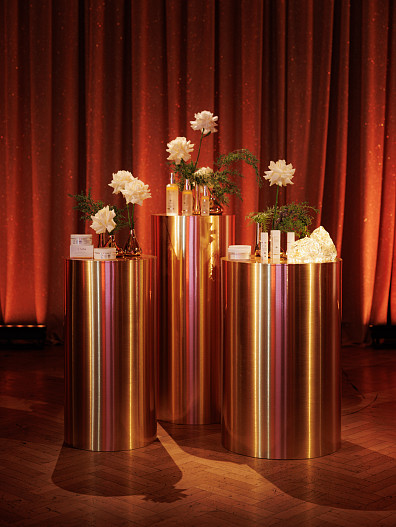 Все пространство было разделено на несколько смысловых зон: сразу при входе гостей встречали каскады бокалов шампанского, задавая настроение вечера с самого начала. Далее гости переходили к сверкающей фотозоне и лаунж-пространству для отдыха с приветственными напитками. Особой популярностью пользовался «Коридор достижений» — инсталляция, посвященная истории бренда d’Alba. Здесь были представлены ключевые этапы развития марки, важные вехи становления и планы на будущее как в России, так и на международной арене. Также в данном пространстве расположилась экспозиция бестселлеров бренда: культовые пламперы, патчи и легендарная спрей-сыворотка, которую можно было протестировать на месте.