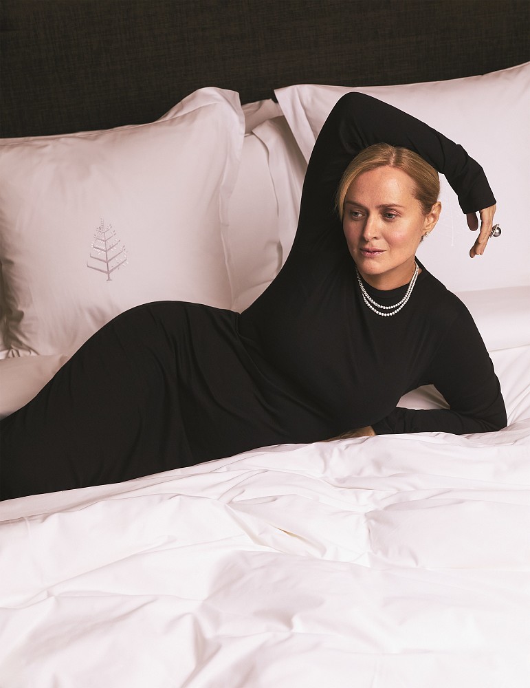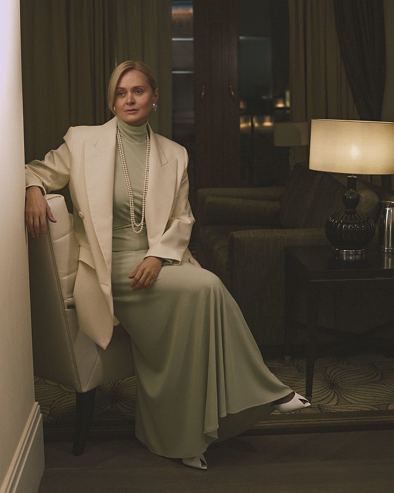 На Анне: Колье, серьги, браслет — всё Mercury, коллекция Classic, белое золото, бриллианты, жемчуг Тотал look Agree