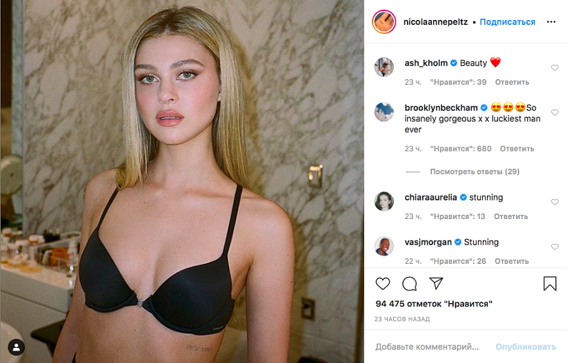 Бекхэм-младший и его избранница не стесняются публично демонстрировать чувства друг к другу: Никола публикует совместные снимки, а Бруклин оставляет под ними трогательные комментарии. Несколько недель назад он признался актрисе в любви, а после сделал ей комплимент, от которого не откажется ни одна девушка.