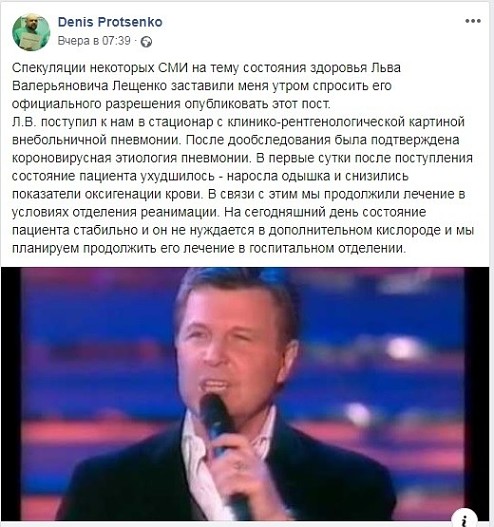 Ранее с официальным заявлением выступил главврач больницы в Коммунарке Денис Проценко. Он подробно рассказал о состоянии Лещенко с разрешения самого артиста: «Лев Валерьянович поступил к нам в стационар с клинико-рентгенологической картиной внебольничной пневмонии. После дообследования была подтверждена короновирусная этиология пневмонии. В первые сутки после поступления состояние пациента ухудшилось - наросла одышка и снизились показатели оксигенации крови. В связи с этим мы продолжили лечение в условиях отделения реанимации. На сегодняшний день состояние пациента стабильно и он не нуждается в дополнительном кислороде и мы планируем продолжить его лечение в госпитальном отделении».