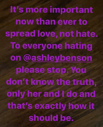 «Сейчас как никогда важно нести в мир любовь, а не ненависть, - отметила звезда в сторис. - Все, кто ненавидят Эшли, пожалуйста, прекратите. Вы не знаете всей правды - только мы с ней знаем. И так все и должно быть».
