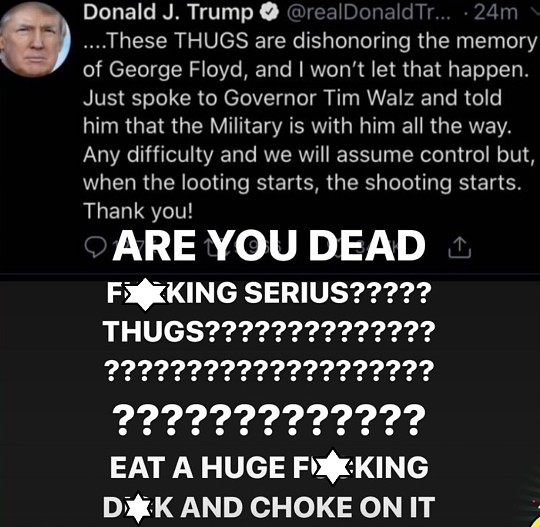 Что же касается отношения к президенту Дональду Трампу, Билли Айлиш категорична. В ответ на один из его твитов, где он выразил свое отношение по поводу выхода на акции протеста тысяч людей, назвав их "бандитами", 18-летняя артистка резко ответила: "Бандитами? Чёрт возьми, ты серьезно??? Возьми в рот огромный член и подавись им!"