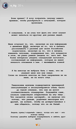 "К сожалению, я не учла тот факт, что этот плакат может читаться по‑другому для разных людей, - прокомментировала Эрика. - Меня огорчает, что , несмотря на всю информацию о движении #BLM, несмотря на то, что я пытаюсь рассказать о расизме для своих российских подписчиков, несмотря на то, что я пытаюсь изменить ситуацию, поддерживая тех, кто нуждается в этом, вы решили увидеть то, чего нет. Вам интереснее увидеть скандальный заголовок, составленный из информации, которая не имеет никакого отношения к вам и является ложной.