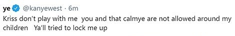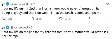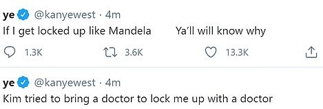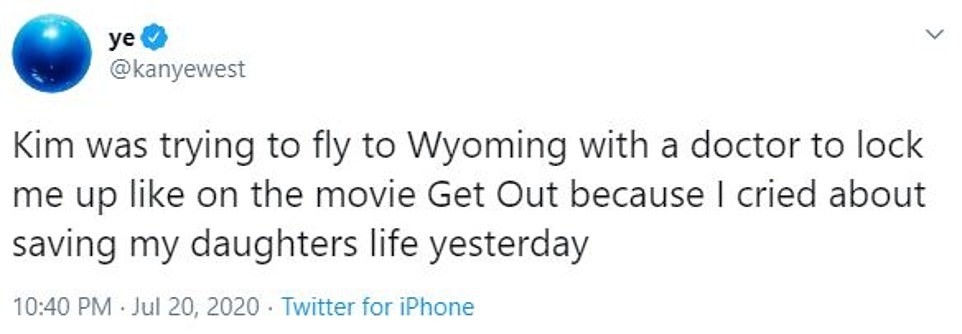 «Ким пыталась прилететь в Вайоминг с доктором, чтобы запереть меня, как в фильме «Прочь» (Get Out), поскольку вчера я расчувствовался на тему того, как спас жизнь своей дочери. Если меня посадят, как Манделу, вы узнаете, почему», — написал Уэст.