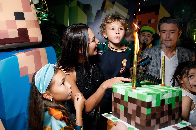 Кульминацией праздничного вечера в честь младшего сына Жирковых стал вынос торта, исполненного в стиле его любимой видеоигры Майнкрафт.