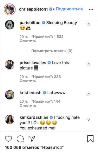 В комментариях к оригинальному снимку звезда Keeping Up With the Kardashians была менее тактичной: «Я чертовски тебя ненавижу! Ты меня вымотал!» А вот ее близкой подруге Пэрис Хилтон снимок понравился. «Спящая Красавица», — написала знаменитая блондинка под постом. Один из поклонников Кардашьян также отметил: «У нее четверо детей… Ей можно».