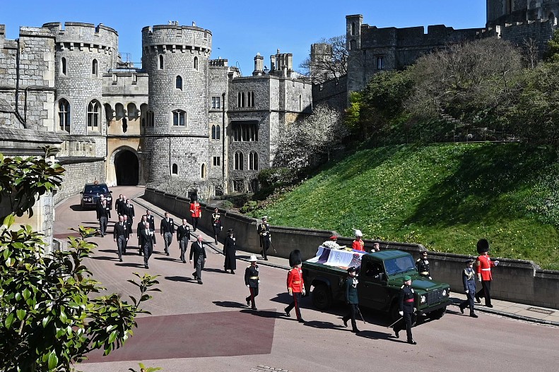 Ее Величество выглядела убитой горем и почтительно склонила голову, сопровождая гроб своего любимого Филиппа. Гроб герцога Эдинбургского был покрыт его личным штандартом, сверху лежала военно-морская фуражка, меч и венок из белых цветов, лично подобранных королевой. Кепку, накидку и перчатки Филиппа привезли в отдельной карете на пустом сидении.