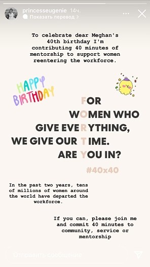 В свой день рождения герцогиня Сассекская выпустила видео, в котором анонсировала свою новую инициативу 40x40. В честь своего 40-летия Меган Маркл попросила 40 друзей посвятить 40 минут разговору с женщинами, которые собираются вернуться в рабочую среду после сокращений во время пандемии коронавируса.