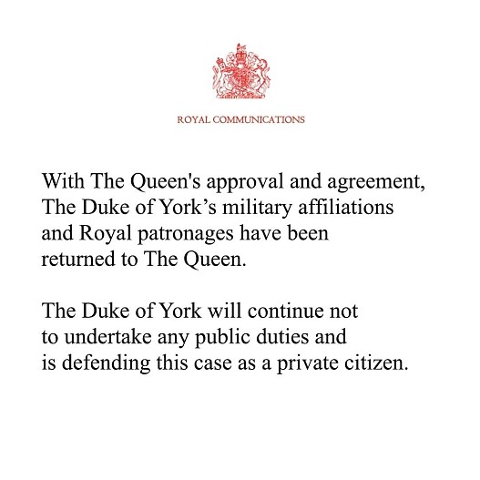 «С одобрения и согласия королевы почетные воинские звания и королевские патронажи герцога Йоркского возвращены королеве. Герцог Йоркский не будет выполнять никаких публичных обязанностей и будет защищать себя в этом деле как частное лицо», – сообщается в заявлении дворца.