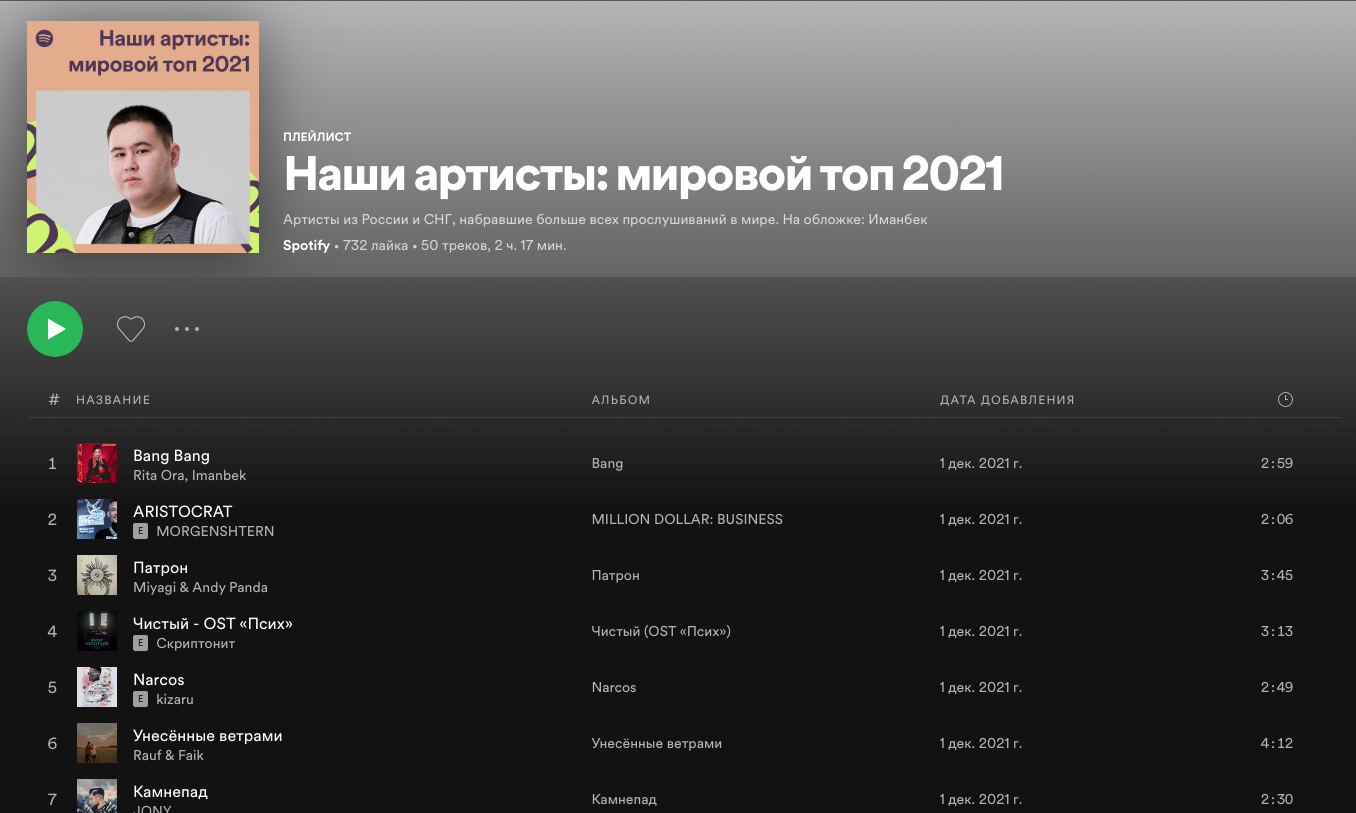 В 2021 году Imanbek возглавил обложку плейлиста «Наши артисты: мировой топ 2021», в котором собраны треки исполнителей из России и СНГ с наибольшим количеством прослушиваний в Spotify.