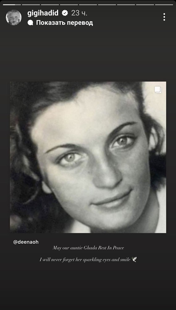 Свою боль от потери близкого человека выразила в инстаграме и Джиджи Хадид. Она опубликовала архивные фото Гады, написав: «Пусть наша тетя Гада покоится с миром. Я никогда не забуду ее сияющие глаза и улыбку».
