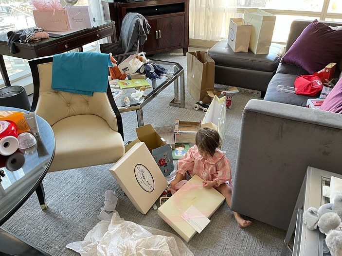 Маленькая Ода Валентина распаковывает подарки в свой день рождения.