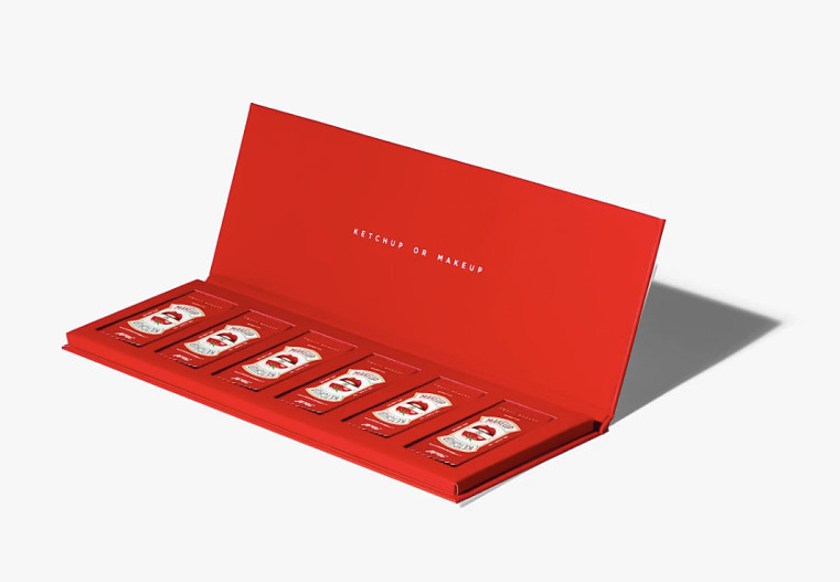 В палетке шесть одинаковых пакетиков красного цвета, каждый из которых оформлен в виде упаковок соуса. Покупателям предлагается наугад выбирать предмет и полагаться на свою удачу: только в одной упаковке окажется блеск для губ от Fenty Beauty — Gloss Bomb вишневого оттенка. Отсюда и название «Ketchup Or Makeup» («Кетчуп или косметика»).