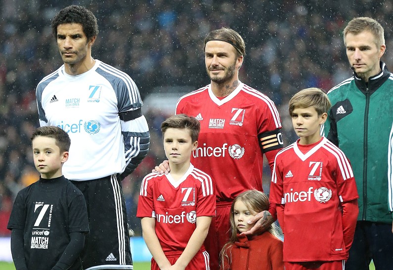 В субботу на стадионе «Олд Траффорд» прошел товарищеский матч, призванный собрать деньги в Детский фонд ООН. Игру организовал Дэвид Бекхэм, бывшая звезда «Манчестер Юнайтед». Поддержать папу пришли и его дети.