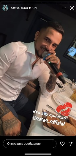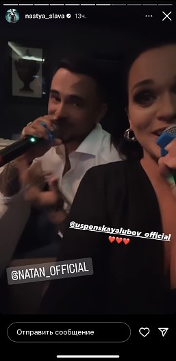 В ночь со среды на четверг Слава в своих социальных сетях опубликовала ряд видео, после просмотра которых становится очевидно, что она провела ночь в компании артиста Black Star — Natanа. По всей видимости, «друзья» решили приятно отдохнуть в четверг в VIP-комнате караоке-клуба.