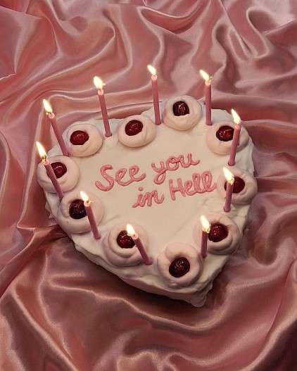 Звезда опубликовала фото торта в форме сердца, увенчанного розовыми праздничными свечами и надписью: «Увидимся в аду». Бритни отключила комментарии и подписала пост двумя смайликами с маникюром.