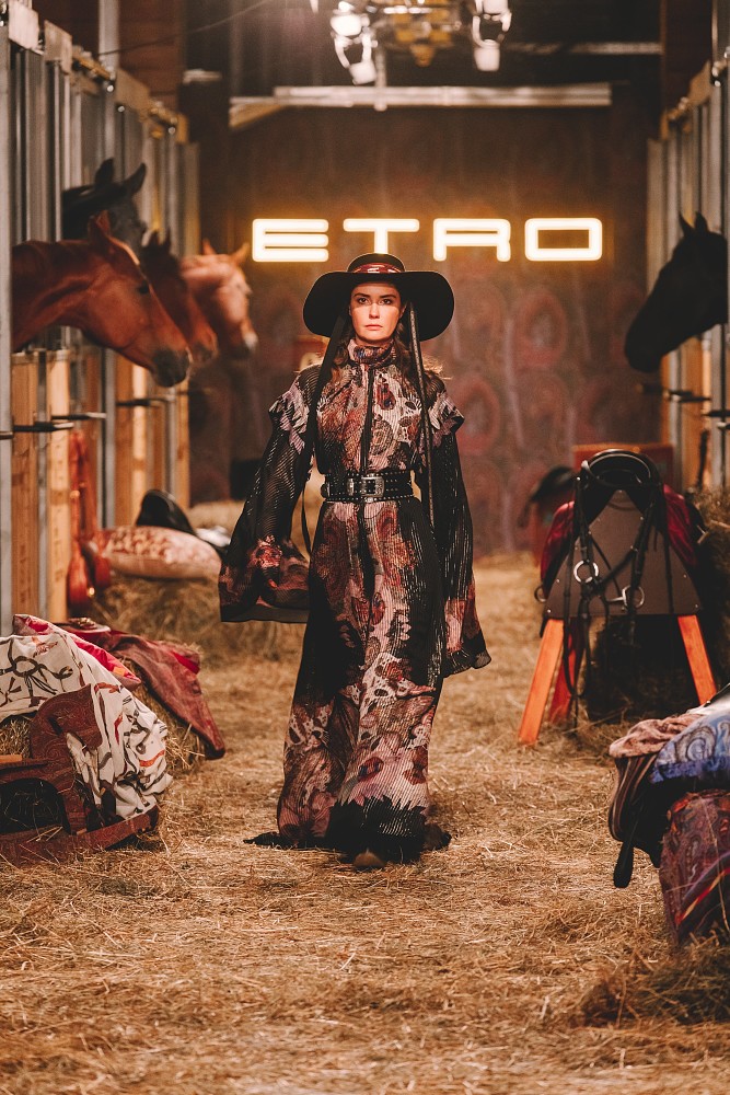 Благодаря реалистичным декорациям и профессиональной постановке, превращающей дефиле в настоящее шоу, BOSCO FASHION WEEK воссоздал уникальную атмосферу, в которой создавалась коллекция. В каждом видео подчеркнута своя индивидуальность и особый характер бренда. В новом сезоне Etro FW 20-21 - изысканность, эклектика, аргентинское настроение верховой езды и балканские мотивы. Эстетика Etro отображается в показе, стилизованном в конюшнях крупнейшего конно-спортивного клуба ГБУ «СШ «Битца» Москомспорта, который был построен к Олимпиаде ’80. Вместе с клиентами коллекцию представили актрисы театра и кино Агата Муцениеце и Дарья Повереннова.