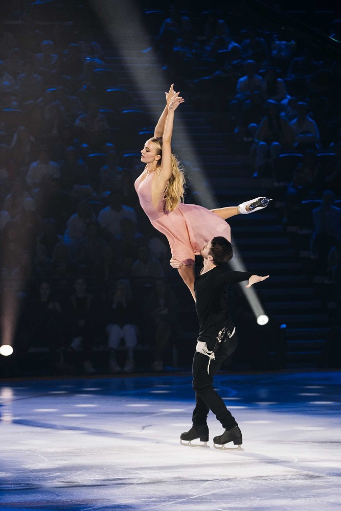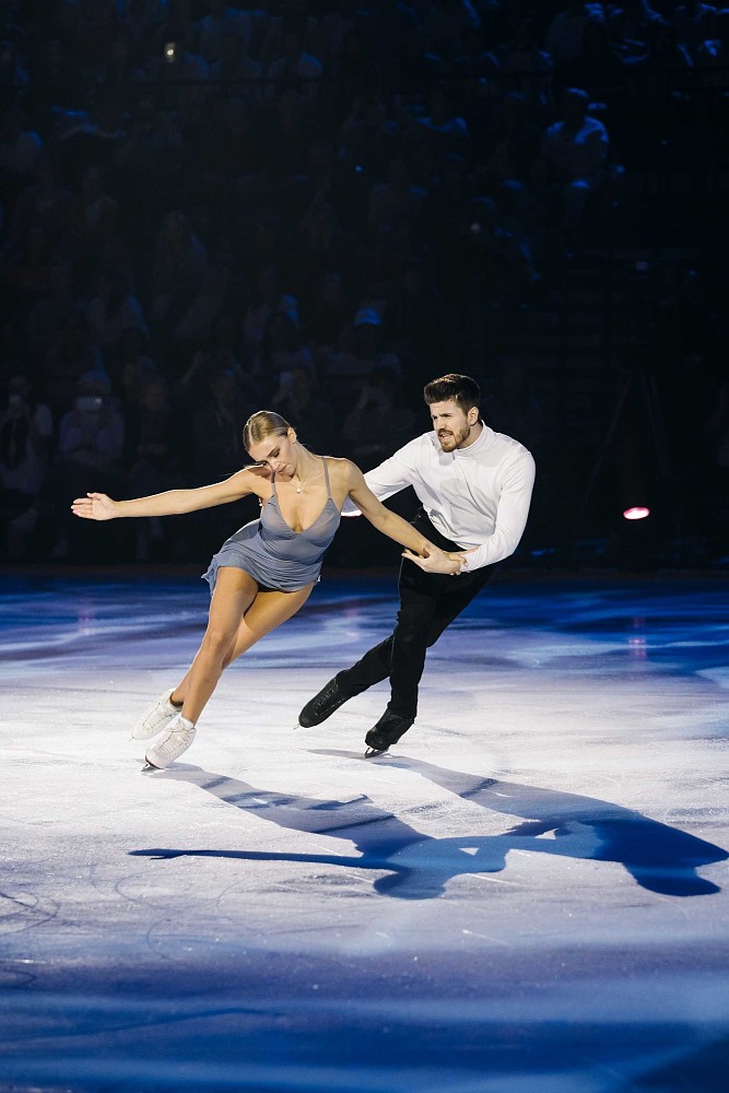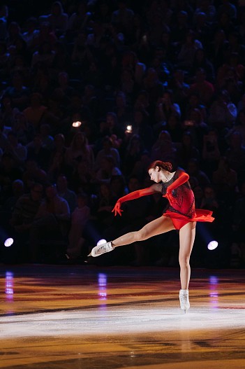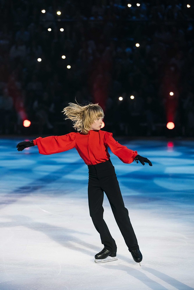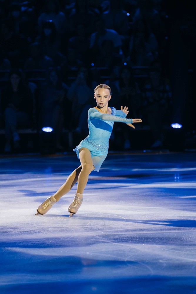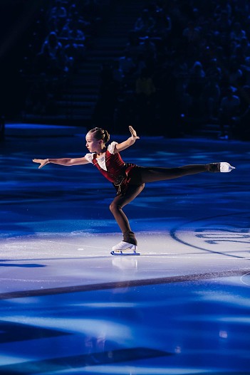 Настоящей звездой шоу стала «русская ракета» Александра Трусова, которая исполнила парный номер с тренером Дмитрием Михайловым, а затем сольный — с четверными прыжками.