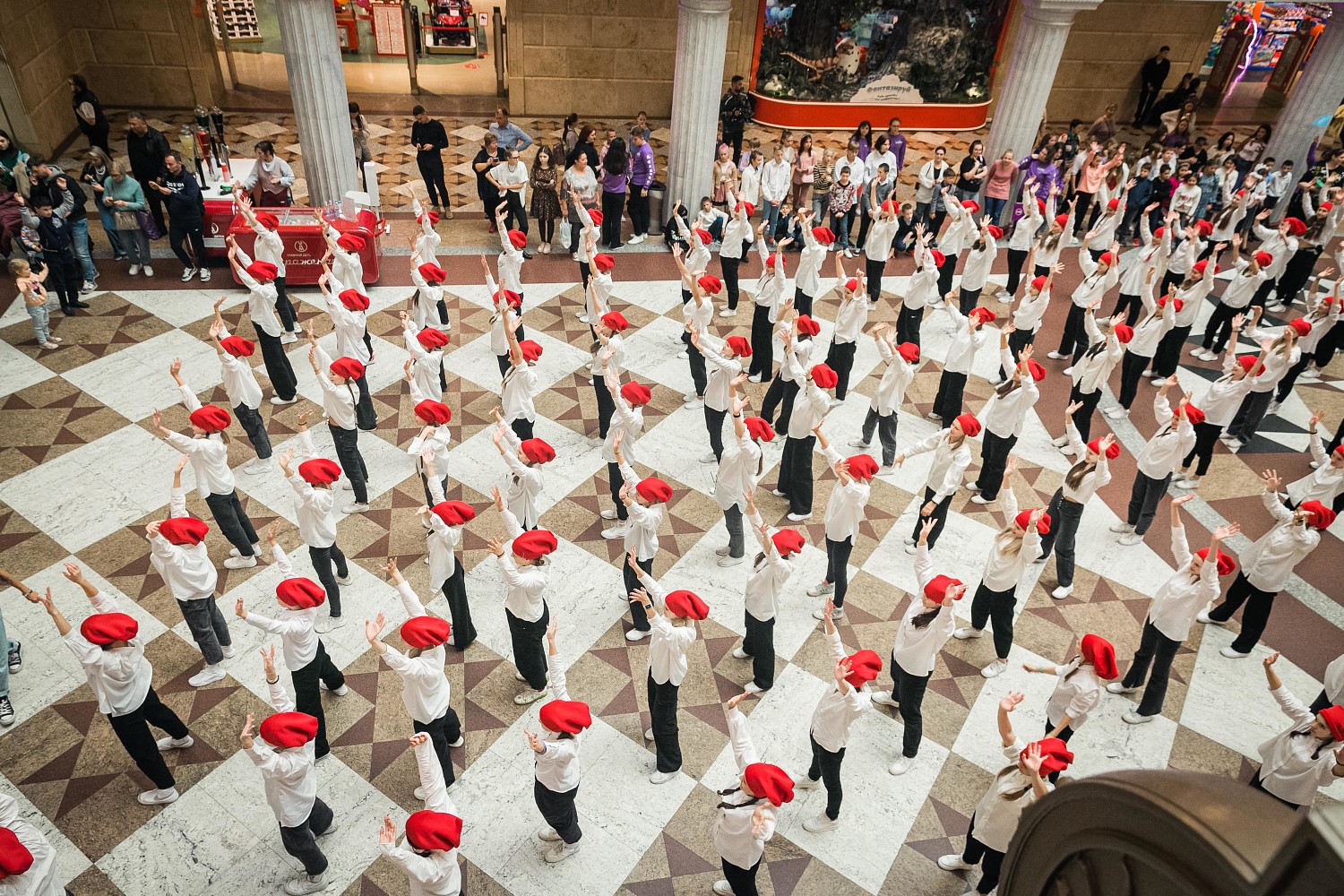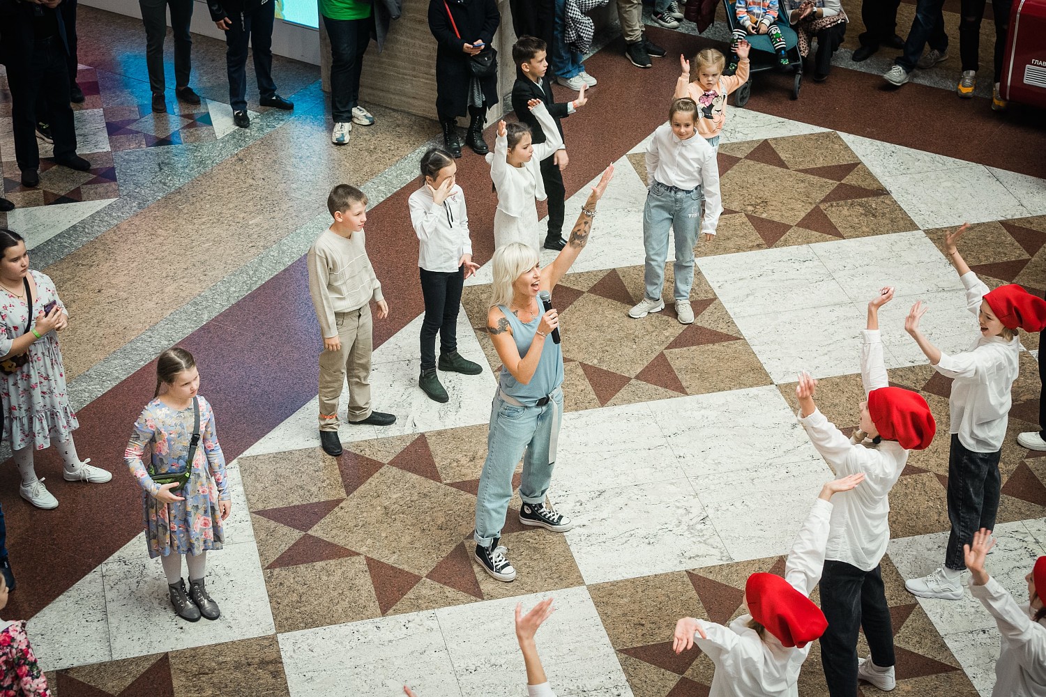 Праздничная программа открылась масштабным флешмобом от участниц школы-студии Аллы Духовой TODES: 150 Красных Шапочек в главном атриуме ЦДМ исполнили зажигательный танец под главный саундтрек фильма «Не опусти» от артистки лейбла Black Star Анет Сай.