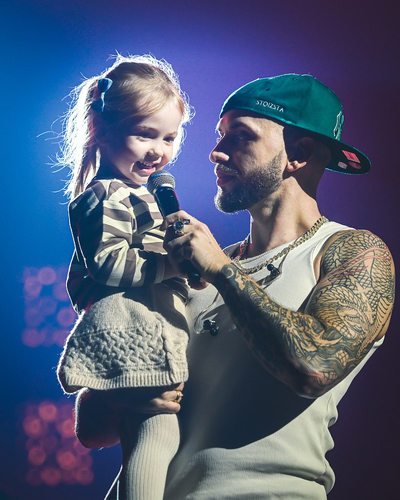 Были и слезы под песню «Родители», и юмористическая мантра под песню «Балалайка». А самым трогательным моментом вечера стал выход на сцену беременной жены музыканта, Ассоль, с их маленькой дочкой Эстель.