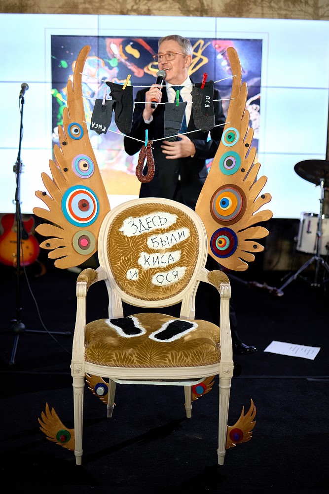 Изумруд от партнера вечера ювелирной компании Flawless скрывал в себе авангардный стул «Крещендо» от художника абстракциониста Алексея Ваулина.