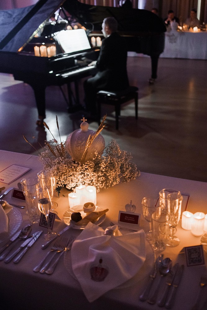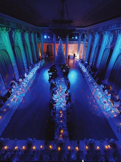 Получив памятную фотографию с новогодней елкой, гости были приглашены за праздничный стол, который был украшен керамическими коронами и рушниками с вышитыми на них двуглавыми орлами, созданными студентами Московского художественно-промышленного института во главе с ректором, Алексеем Егоровым. Молодые ребята не только разработали целый дизайн-проект украшения зала и воплотили его в жизнь, но и прибыли на само мероприятие в исторических костюмах-реконструкциях, встречая гостей на парадной лестнице.