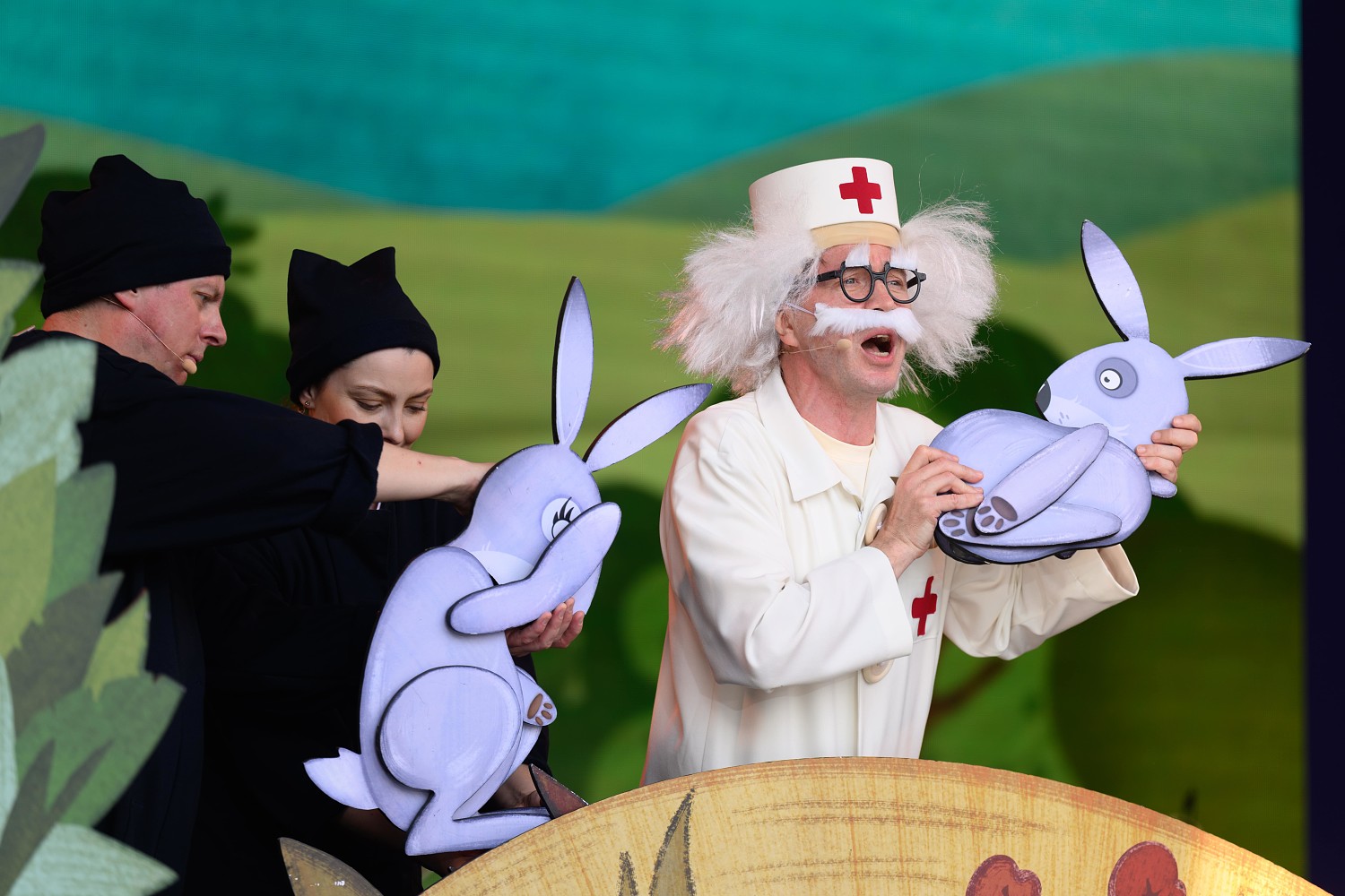 «Мне давно хотелось сделать что-то по Чуковскому. Я очень люблю Корнея Ивановича и как личность, и как писателя, поэтому, когда возникло желание сделать для фестиваля постановку про Айболита, я пересмотрел все художественные и мультипликационные фильмы, пластинки и понял, что нужно не брать старое, а сделать что-то оригинальное. Тогда я обратился к моему другу, композитору Петру Дранге с тем, чтобы он написал музыку. А дальше стал думать, кто бы мог быть режиссером этой постановки. Поскольку Алексей Франдетти отличается очень пластичным творческим подходом и использует в своих спектаклях самые разные жанры и самую разную фактуру, выбор пал на него. При первой же встрече он предложил артистов театра кукол, идею видеоконтента, кандидатуру художника по костюмам. А дальше начались репетиции… Я, честно говоря, рассчитывал, что буду стоять с пюпитром и читать текст на фоне прекрасной музыки Дранги, а артисты с куклами будут разыгрывать сюжет. А оказалось — ничего подобного! В итоге мы показали настоящий спектакль, в котором я, как артист, сыграл три роли — рассказчика, Айболита и Бармалея», — поделился Евгений Миронов — народный артист Российской Федерации, художественный руководитель Театра Наций и Московского детского фестиваля искусств «НЕБО».