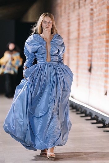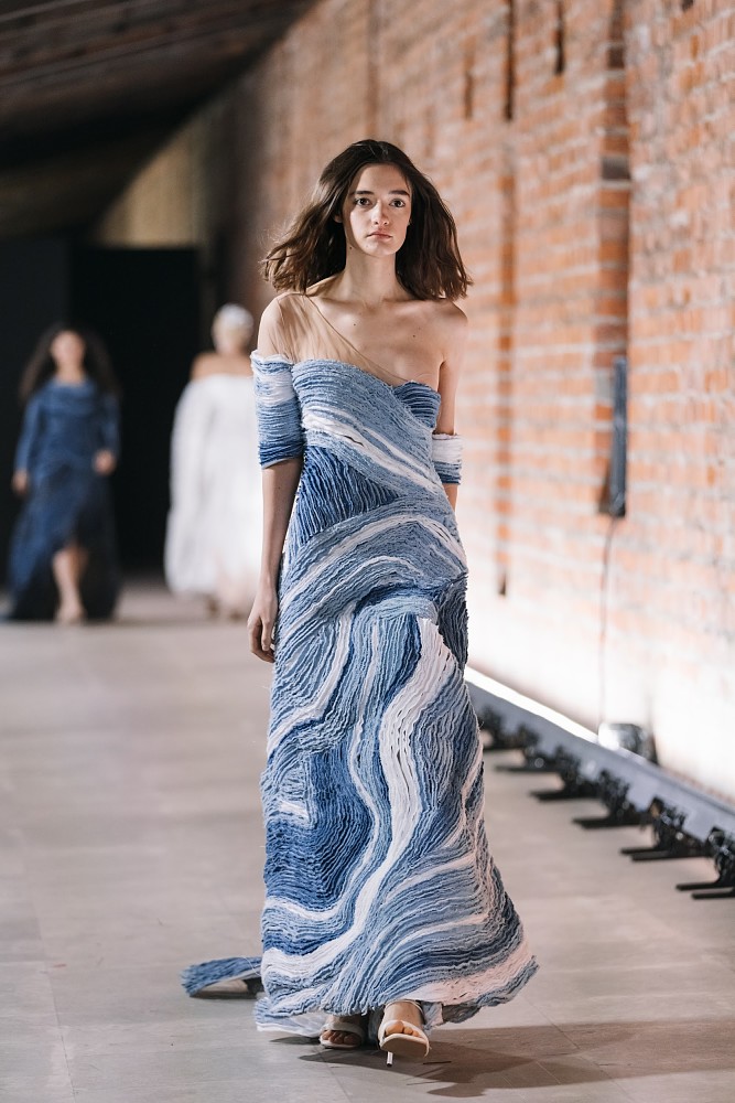 •    Деним‑барельеф. Платья и комплекты из денима, собранные из настрочных полос, удерживающих объем; прямая отсылка к коллекции «Садко», показанной в новой графике.