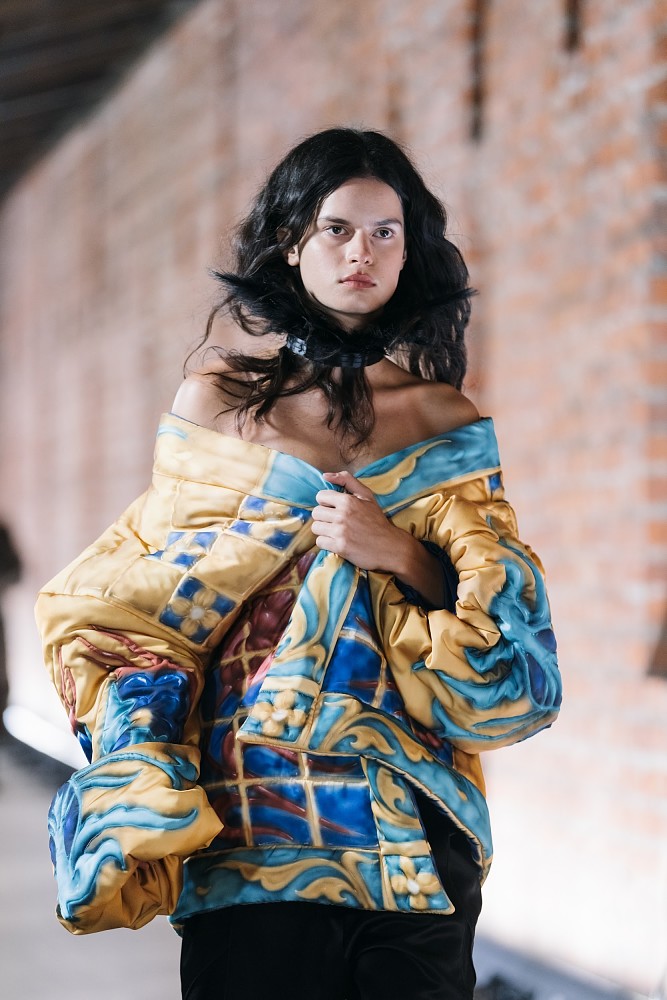 •    Изразцы и стёжка. Мотивы старинной керамической росписи переведены в современные принты с глянцевым «эмалевым» эффектом и собраны в дутые формы.