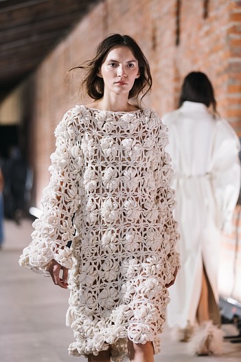 •    Ручные техники. Вязаные и «запечатанные» в прозрачные ткани орнаменты, кожаные «пайетки» крупного масштаба, кропотливая работа рук — без кутюрной вычурности, с акцентом на носибельность.