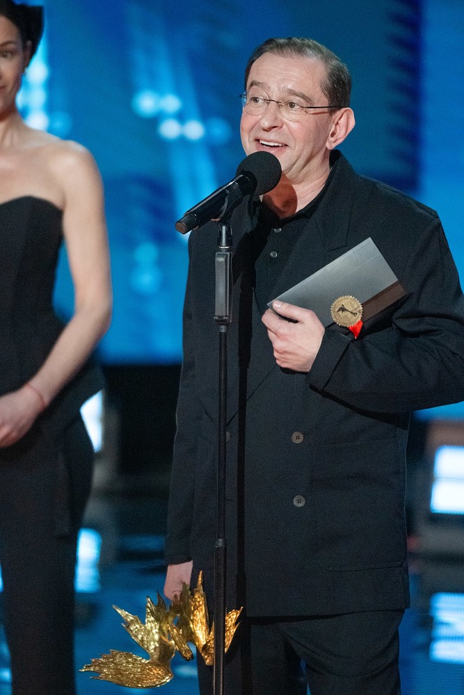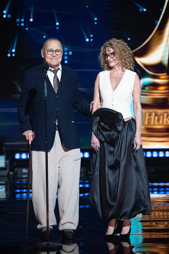 Приз победителю вручали президент киноакадемии, режиссер Андрей Кончаловский и его жена, актриса Юлия Высоцкая.