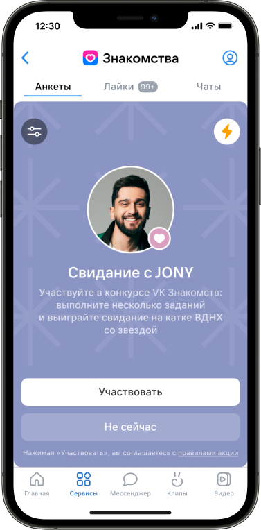 Претендентам на свидание нужно найти анкету артиста в VK Знакомствах и выполнить несложные задания: например, ответить на несколько вопросов о творчестве и жизни звёзд. В начале февраля знаменитости лично нажмут на кнопку рандомайзера и определят двух счастливчиков, которые пойдут на свидание: победитель — с Мари Краймбрери, победительница — с JONY. Во время встречи тренер по фигурному катанию даст каждой паре небольшой мастер-класс на катке ВДНХ. Кроме того, победители смогут пообщаться с кумирами наедине.