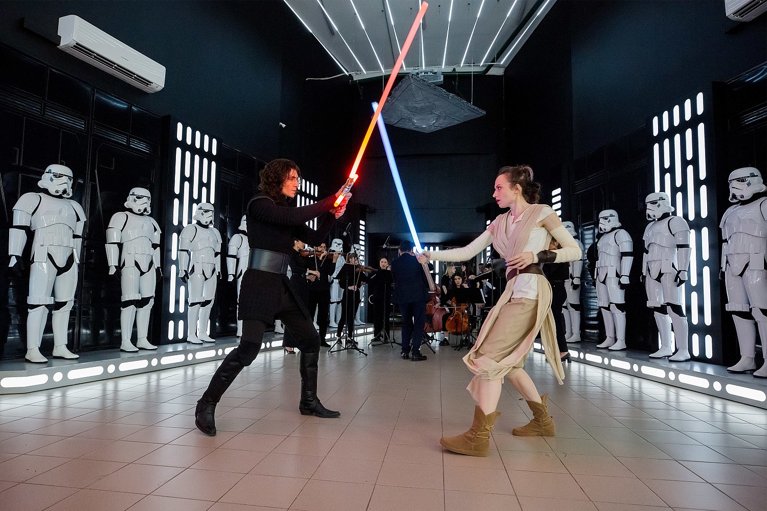 Под звуки Имперского марша Джона Уильямса выставку официально открыли, и гости вечера прошли в выставочное пространство по ступеням, украшенным знаменитыми открывающими титрами «Давным-давно, в далекой Галактике…». Внутри их встретили 16 тематических зон, каждая из которых воссоздает определенную сцену из «Звездных войн». Принцесса Лея, Дарт Вейдер, генерал Гривус, сенатор Палпатин, Люк Скайуокер, Мандалорец и, конечно же, Магистр Йода - далеко не все герои, которых можно встретить на выставке.
