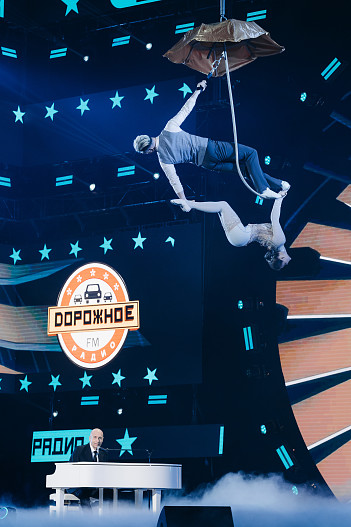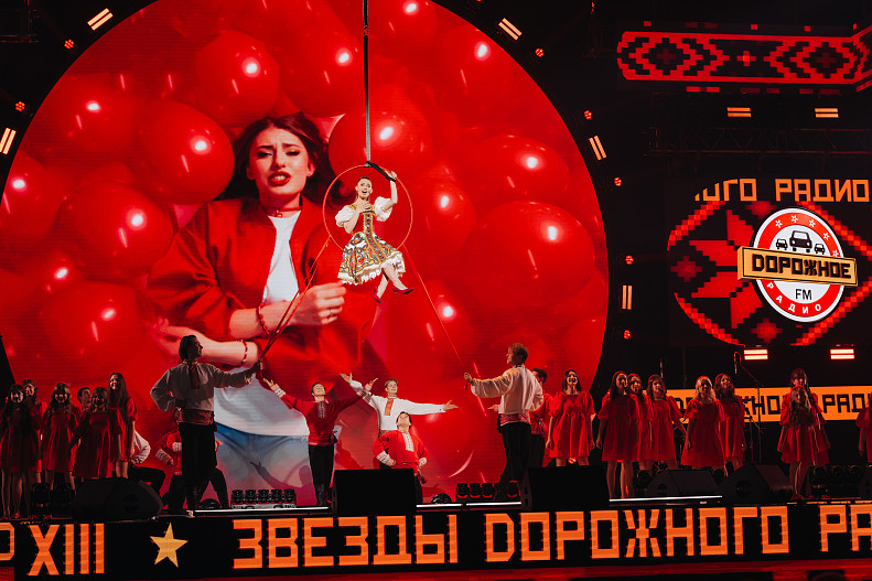 «Звёзды Дорожного радио» продолжились масштабным дефиле — более 200 артистов балета держали в руках таблички с названиями городов, где вещает радиостанция. А затем перед зрителями появилась ведущая вечера — легенда телеэфира Яна Чурикова. Она поприветствовала аудиторию и дала старт выступлениям музыкантов.