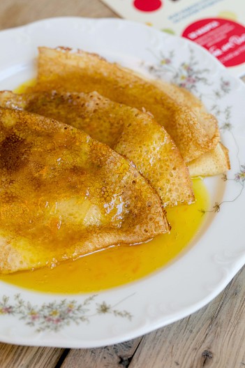 3. Блины сворачиваем треугольниками и кладем в горячий соус. По желанию можно сбрызнуть ликером и сделать фламбе. В этом случае будьте осторожны: ни в коем случае не наклоняйтесь над сотейником; поджигайте спичкой, быстрым и четким движением, тут же отдернув руку.