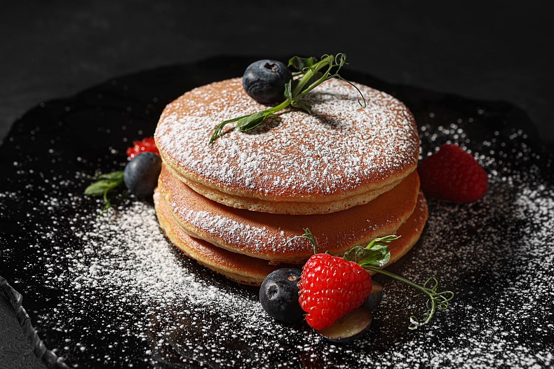 2. Выпекаем на медленном огне с двух сторон. Выкладываем на тарелку, посыпаем сахарной пудрой и украшаем ягодами.