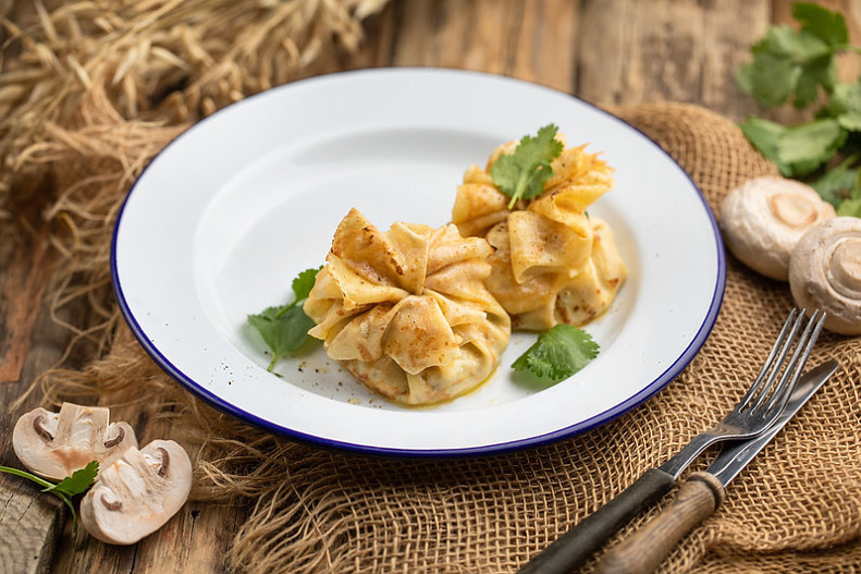 4. В блины заворачиваем начинку в форме мешочков, связываем ветками которые остались от зелени. (Ветки зелени необходимо ошпарить в кипятке для мягкости). Готовые мешочки разогреваем на сковородке на масле или в духовке. При подаче украшаем листьями кинзы.