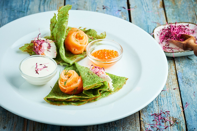 4. Добавляем пюре из шпината в тесто и перемешиваем. Оставляем тесто на 15-20 мин. Выпекаем на совороде. Блинчики из шпината готовы. Разрезаем блинчики пополам и подаем к столу. К ним идеально подходит сливочный сыр, слабосоленый лосось и красная икра.