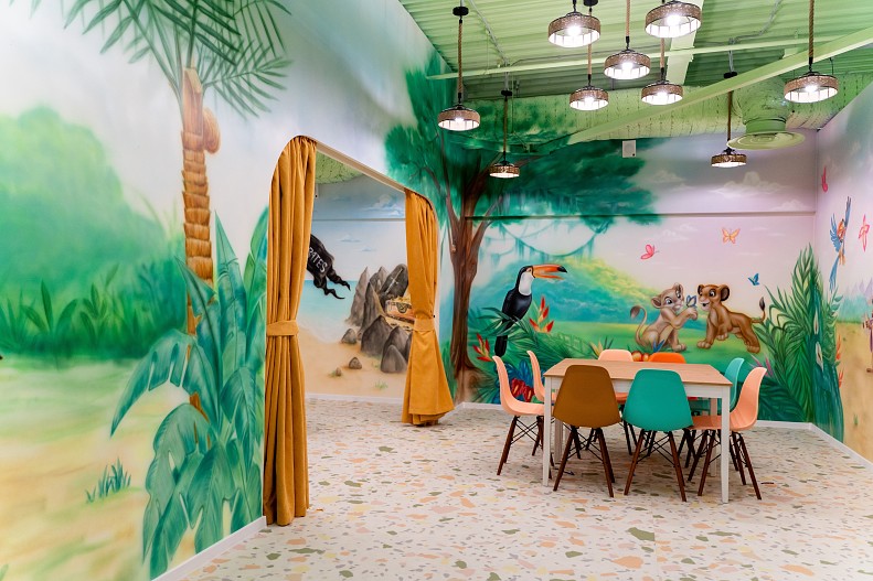 В основу концепции интерьеров ресторана легли мотивы любимого детского мультфильма «Король Лев», сказочное сафари и образы любимых детьми сказочных животных. Охристые тона «саванны» и зеленые «оазисы», по замыслу дизайнеров, идеально гармонируют с интерьерами торговых галерей «Крокус Сити Молла».