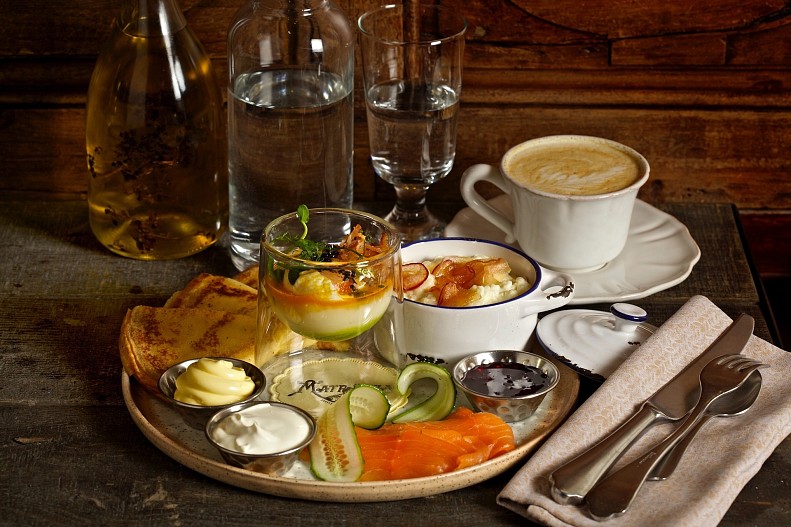 Меню à la carte для удобства разделено по темам: яйца, каши, пирожки, молочное, блины, каши, пирожки, молочное, блины, домашний хлеб, сладкое. Пирожки из печи можно заказать с картошкой, с капустой и яйцом, с бараниной, с говядиной или же попробовать расстегай с рыбой. Любителям молочных продуктов предложат домашний йогурт или сырники с топленым творогом и вареной сгущенкой. И наконец, нельзя не упомянуть блюда, без которых очень трудно представить завтрак — блины — классические русские или с начинкой из рассольного сыра и пшена, утки и гречки либо говядины. Ажурные «красные» блины по традиционному рецепту выпекают каждое утро прямо в зале ресторана, наполняя все вокруг чарующими ароматами.