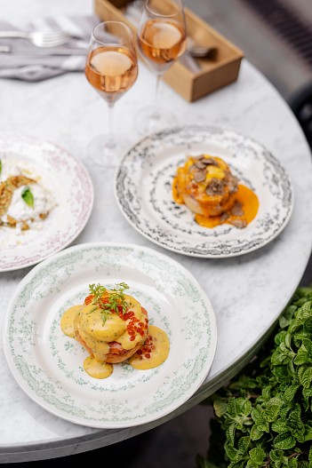 Другой возможный сценарий – неторопливый французский завтрак с круассанами и кофе, к чему атмосфера Патриарших особенно располагает. В меню есть два вида круассанов с начинкой из заварного или фисташкового крема и другая выпечка. Еще один сценарий – завтрак с игристым. К нему идеально подойдет яйцо бенедикт с черным трюфелем или с лососем – их подают на булочке маритоццо или фирменные оладьи со страчателлой.