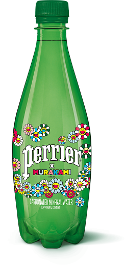Фирменные улыбающиеся цветы Мураками добавят весенней яркости культовым зеленым бутылкам PERRIER объемом 0.75л, 0.5л и 1 л. Также будет выпущен ограниченный тираж коллекционных бутылок 0.75 л с трафаретной печатью на стекле. Эти эксклюзивные бутылки не поступят в продажу.
