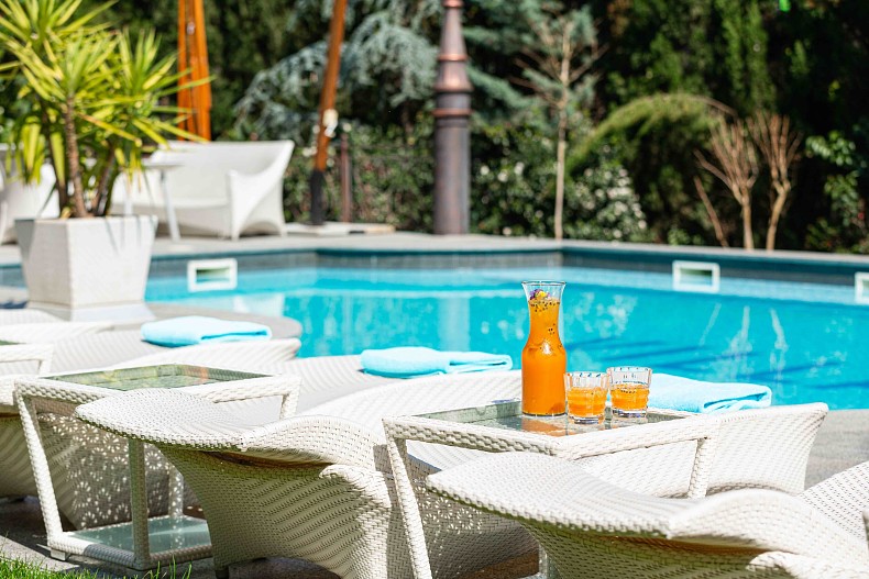 Красота территории Villa Elena – с вечнозелеными растениями, бассейном, фонтаном, коваными оградами и множеством цветов – создает особое настроение каждому гостю ресторана. Парадная лестница ведет к огромной террасе ресторана с прекрасным видом на старинный особняк и территорию отеля. Атмосферность места подчеркивает белый рояль, установленный на террасе – в ресторане регулярно проходят ужины при свечах с живыми джазовыми концертами. Южную красоту нового ресторана подчеркивает обилие цветов, которыми украшена веранда ресторана — цветочное оформление нового заведения создано с помощью специалистов знаменитого Никитского ботанического сада, что находится под Ялтой.