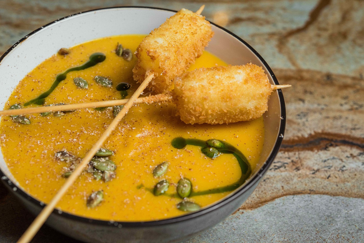 В разделе закусок бестселлерами обещают стать паштет из печени цесарки с цитрусовым джемом и битыми огурцами, мидии в азиатском стиле с соусом из кешью и креветки темпура с соусом Том Ям. На обед отлично подойдет тыквенный суп-пюре с жареным сыром сулугуни, телячьи щечки «по-тоскански» и утиное филе с колотой полбой и печеными яблоками.