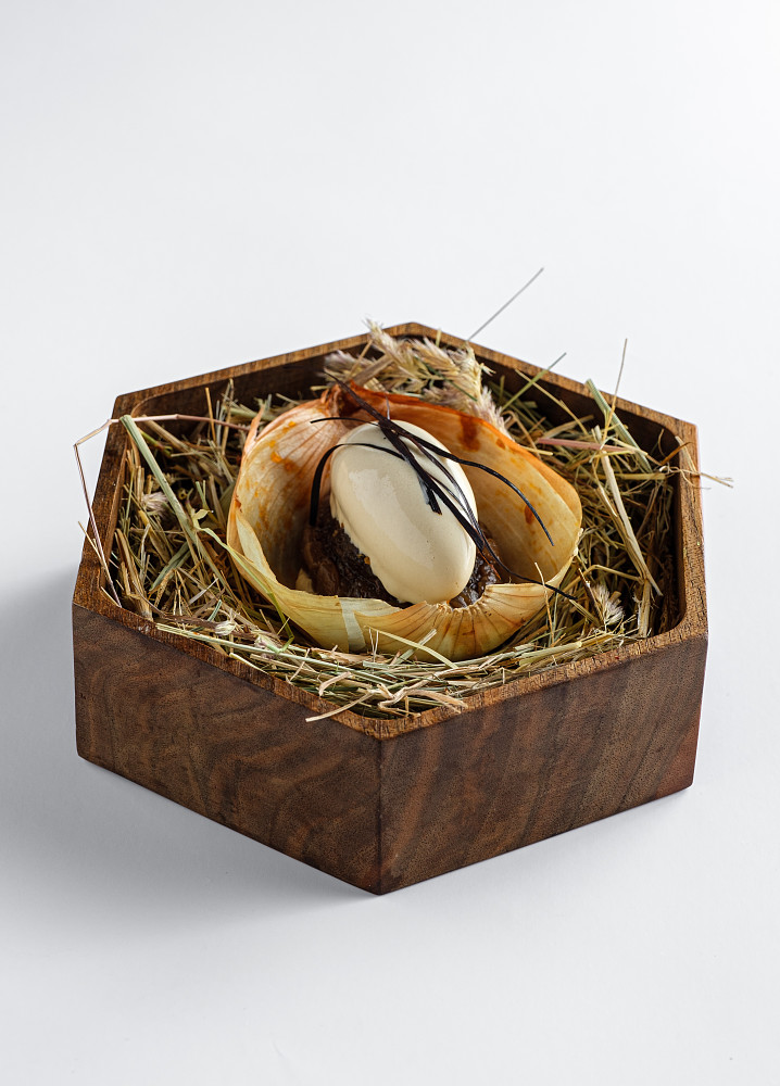 Самая яркая и красноречивая из 12 подач — черненый лук. Именно это блюдо лучше всего отражает идею и суть сета. Черненый лук подают в Artest с самого открытия, но за время существования ресторана он претерпел серьезные изменения. Изначально вкус лука в блюде пытались адаптировать: он подавался с черной икрой, эспумой и мороженым из пармезана, который значительно доминировал над другими ингредиентами. Новая версия призвана показать, как не только идея, но и сам продукт меняются под воздействием времени. Теперь блюдо полностью состоит из лука в разных формах и состояниях: помимо эспумы и мороженого, в нем присутствует белый лук, который готовится в течение 16 часов, а также лук-шалот, который готовится целых 6 месяцев. Это помогает раскрыть его вкус и продемонстрировать сладость. Подается с эссенцией из черненого белого лука и сеном из лука-порея, которые готовятся 3 месяца.